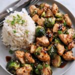 - Serve: Serve the sweet chili chicken and Brussels sprouts hot, accompanied by rice, and garnished with sesame seeds, lime wedges, and extra sweet chili sauce if desired.
