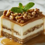 This baklava and cheesecake hybrid is a luxurious dessert that combines the rich, creamy texture of classic cheesecake with the crispy, nutty, honey-soaked layers of traditional baklava. Featuring a phyllo dough crust, a spiced nut filling, and a luscious cheesecake center, all finished with a golden syrup glaze, it’s an unforgettable fusion dessert perfect for holidays and special occasions.