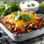 This Beef Enchilada Casserole with Rice is a comforting and flavorful Mexican-inspired dish featuring layers of seasoned ground beef, black beans, corn, enchilada sauce, and melted Mexican blend cheese over a bed of rice. It’s baked to bubbly perfection and garnished with fresh cilantro and optional toppings for a delicious family-friendly meal.
