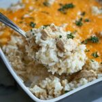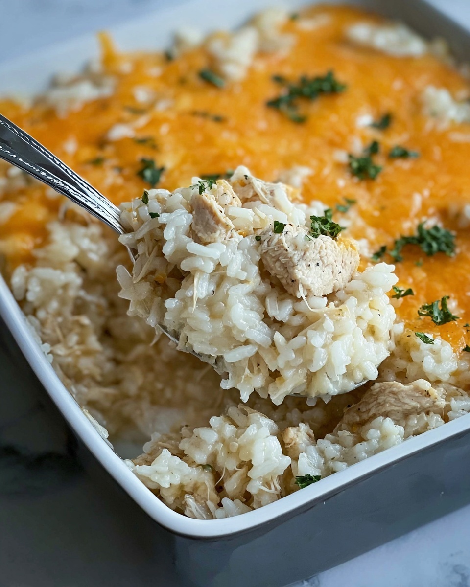 - Garnish and Serve: Once baked, garnish the casserole with freshly chopped parsley if desired. Serve warm and enjoy this creamy and cheesy chicken and rice casserole.