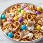 Bunny Bait is a festive, crunchy, and sweet snack mix perfect for Easter celebrations. This easy-to-make treat combines pretzels, cereals, salted peanuts, pastel M&M’s, and sprinkles, all coated in creamy white chocolate. It’s a delightful sweet and salty snack that kids and adults will love.