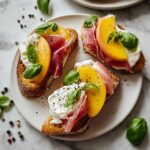 Now for the fun part—gather your burrata and gently tear it into bite-sized portions, carefully nesting it on each piece of crostini. Lay one or two slices of prosciutto over the creamy cheese, then arrange thin wedges of fresh peach on top. This layering ensures every bite celebrates contrast, from crunchy bread to creamy cheese to silky meat and sweet fruit.
