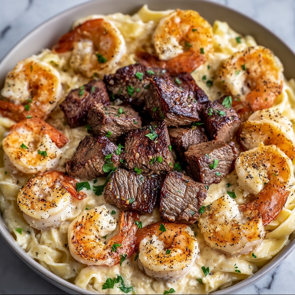 A flavorful and creamy Cajun Shrimp and Steak Alfredo Pasta that combines tender steak and succulent shrimp tossed in a rich Parmesan cream sauce seasoned with bold Cajun spices, perfect for a satisfying weeknight dinner.