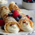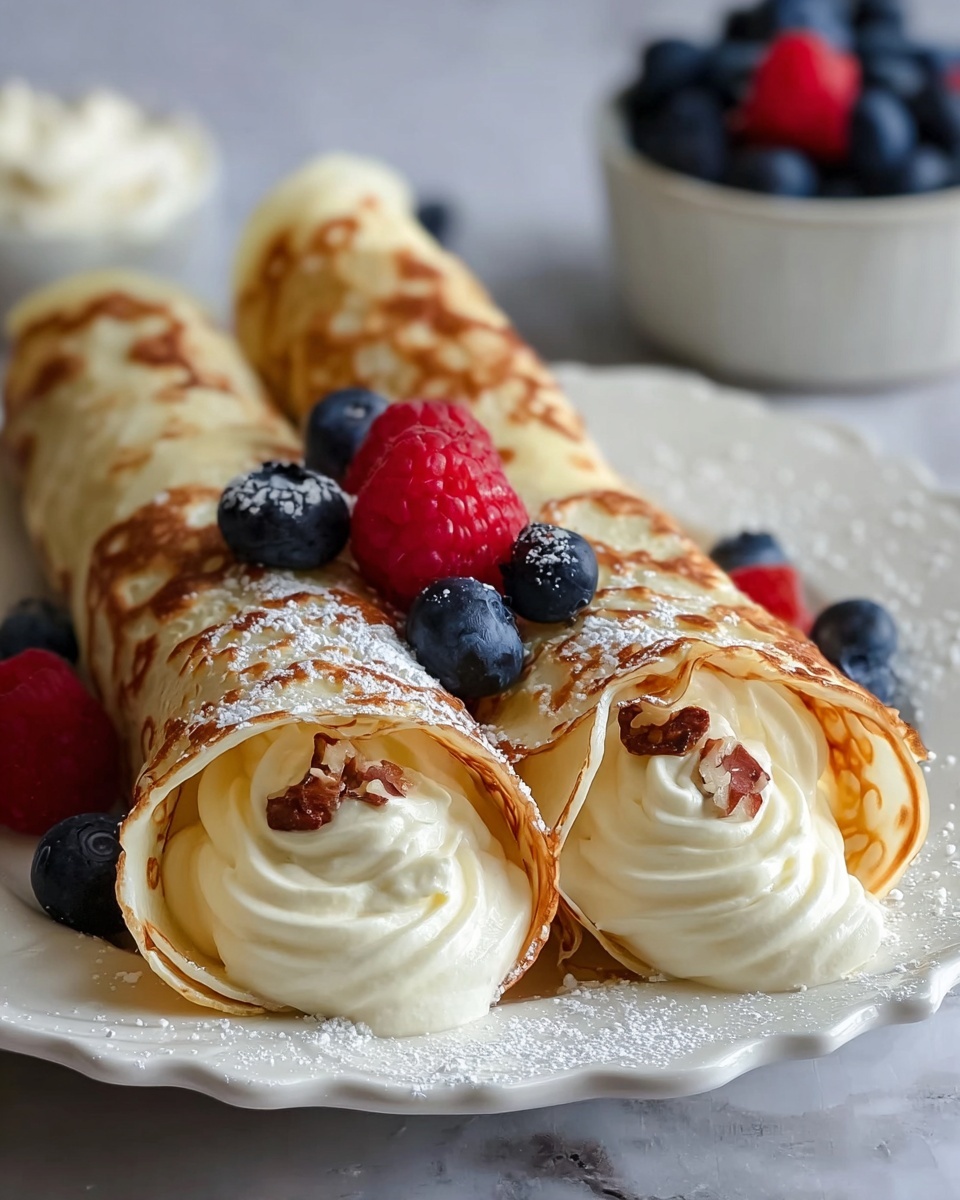 Arrange your cheesecake crepe roll-ups on a serving platter and top them with fresh fruit like sliced strawberries or plump blueberries. The colorful fruit adds a fresh brightness, balancing the creamy richness of the filling beautifully.