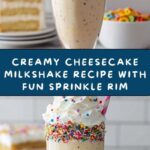 For a fun twist, serve this Cheesecake Milkshake Recipe in small mason jars with colorful reusable straws or mini spoons for scooping out extra thick parts. Another idea is to rim the glasses with crushed nuts or cookie crumbs instead of sprinkles to add a textural contrast and a different flavor profile.