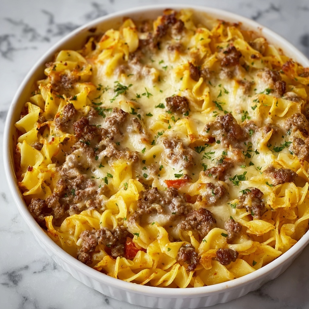A comforting and hearty Cheesy Beef and Noodle Casserole combining savory ground beef, tender egg noodles, and a rich tomato-based sauce, all baked with a creamy cheese topping for a satisfying family meal.