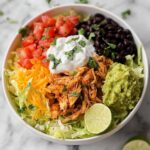 - Assemble Bowls: Divide cooked white rice evenly among 6 serving bowls. Top each bowl with shredded chicken mixture, black beans, shredded iceberg lettuce, shredded Mexican cheese, diced tomatoes, guacamole, and sour cream.