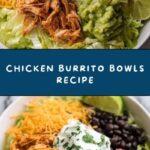 This flavorful Chicken Burrito Bowls recipe features tender, slow-cooked chicken thighs seasoned with taco spices and salsa, served atop a bed of fluffy white rice and topped with fresh ingredients like black beans, shredded lettuce, cheese, diced tomatoes, guacamole, and sour cream. Perfect for a delicious and satisfying meal that’s easy to prepare in advance using a slow cooker.