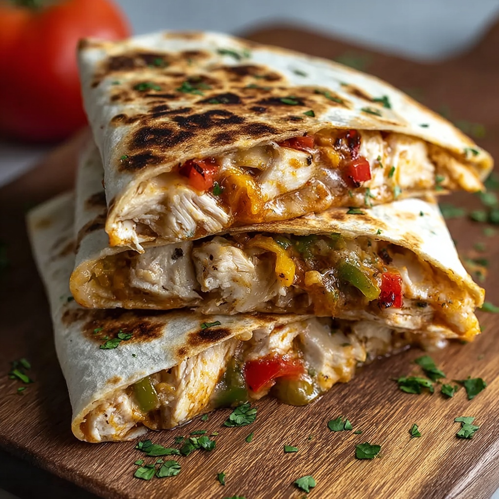 - Assemble the Quesadillas: Lay a flour tortilla flat and sprinkle a portion of shredded cheddar and Monterey Jack cheese on half of it. Layer the sautéed veggies and sliced chicken over the cheese, then top with more cheese. Fold the tortilla over to create a half-moon shape, pressing down gently to seal the filling inside.