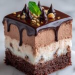 Sprinkle mini chocolate chips or chocolate shavings on top for that extra pop of texture and eye-catching detail. Now you’re ready to slice and serve a crowd-pleasing dessert that’s as delightful to look at as it is to devour.