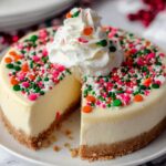 This festive Christmas Sugar Cookie Cheesecake combines a buttery sugar cookie crust with a creamy, smooth cheesecake filling. Perfectly baked and topped with whipped cream and holiday sprinkles or crushed candy canes, this dessert is ideal for celebrating the season with a sweet, rich treat.