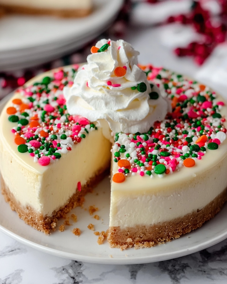 To really bring out the festive vibe, top your cheesecake with freshly whipped cream and scatter bright, colorful sprinkles or crushed candy canes. You can also add a few fresh cranberries or small mint leaves for an elegant look that’s still playful and inviting. These garnishes do more than decorate—they add texture and festive flavor notes.