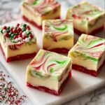 Pour the red-colored fudge evenly into the lined baking dish first, followed by the plain white fudge in the middle, and finish with the green fudge on top. Using a knife or skewer, swirl through the layers to create that beautiful marbled effect. This technique gives your fudge a visually stunning pattern that’s as delightful to look at as it is to eat.