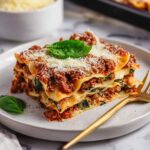 Cover your lasagna dish first with plastic wrap, then foil to lock in moisture, and bake for 15 minutes. Remove the plastic and foil, then bake uncovered for an additional 20 minutes to let the top brown beautifully. If you want an extra golden, bubbly finish, give it a quick broil for 1 to 2 minutes — just be careful to watch it closely so it doesn’t burn!