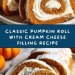 This Classic Pumpkin Roll with Cream Cheese Filling is a moist, spiced pumpkin cake rolled with a smooth and creamy sweetened cream cheese filling. Perfect for autumn gatherings and holiday celebrations, this dessert combines the warm flavors of cinnamon and cloves with a luscious filling, all wrapped in a delicate cake roll dusted with powdered sugar.