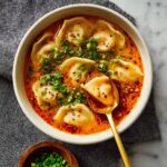 - Garnish and serve: Ladle the hot soup and dumplings into bowls. Drizzle chili oil to taste, and sprinkle with scallion greens, crispy garlic, and chopped cilantro. Serve immediately.