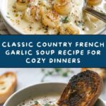 A comforting and aromatic Country French Garlic Soup featuring roasted garlic, sautéed onions, fresh herbs, and a creamy Parmesan-egg yolk finish. This rustic soup is perfect for cozy meals and is served with crusty bread for a satisfying experience.