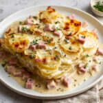 This Cozy Baked Potatoes Cheese Ham recipe features thinly sliced potatoes layered with savory cooked ham, fragrant onions, garlic, and rich Gruyère cheese, all baked together in creamy heavy cream with a touch of fresh thyme and nutmeg. Perfectly golden and bubbling from the oven, this comforting dish makes an ideal hearty meal for family dinners or special gatherings.