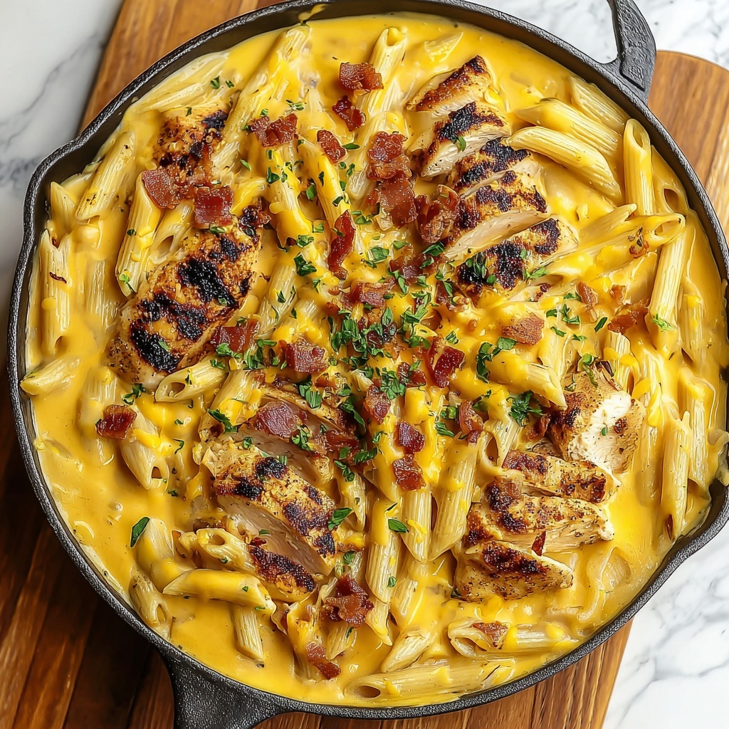 Mix the drained penne into the sauce and chicken, gently tossing so every piece is gloriously coated. Fold in most of the crumbled bacon and half of the shredded sharp cheddar cheese. The heat will melt the cheese beautifully, stringing it through the pasta and sauce for ultimate indulgence.