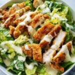 A flavorful and crispy Chicken Caesar Salad featuring oven-baked chicken tenders coated in a seasoned breadcrumb crust, paired with fresh romaine lettuce, crunchy croutons, and a creamy homemade Caesar dressing made with mayonnaise, yogurt, garlic, and Parmesan cheese. Perfect for a hearty, satisfying meal in under 40 minutes.