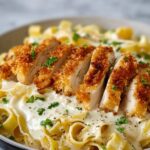 This Crispy Chicken Fettuccine Alfredo combines perfectly golden, breaded chicken cutlets with a rich and creamy homemade Alfredo sauce tossed with tender fettuccine pasta. The dish is a delightful mix of crispy textures and luscious creaminess, making it a comforting yet elegant meal ideal for a family dinner or special occasion.