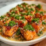 - Garnish and Serve: Garnish with sliced green onions and optional sesame seeds for added texture and aroma. Serve the salmon bites hot for the best experience.