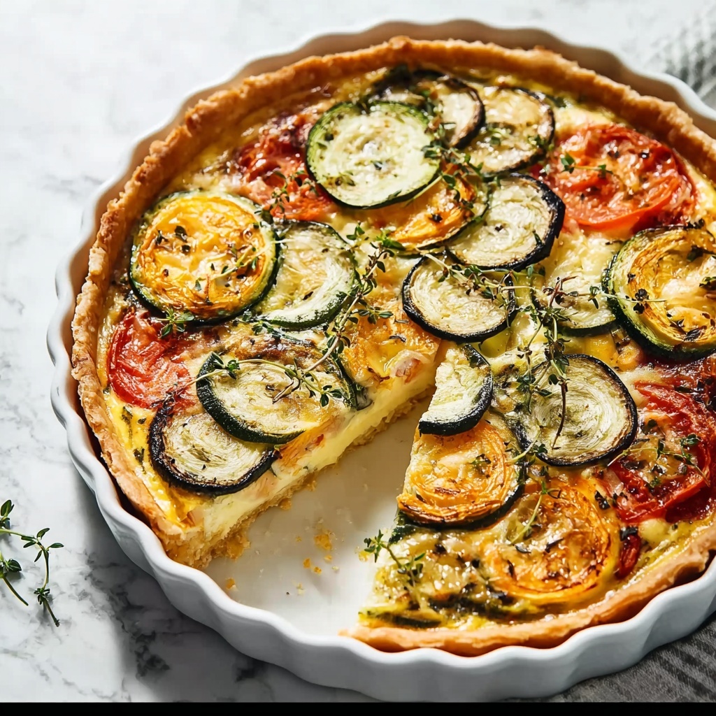 Pour the egg mixture carefully over the layered vegetables, ensuring it penetrates evenly by gently shaking the pan. Then arrange the reserved zucchini and tomato slices on top. These add a decorative touch and an additional pop of color and texture once baked. Pop the quiche into the oven and bake until it’s set and lightly golden on the edges, usually around 35 to 40 minutes depending on your oven.