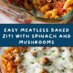 This delicious meatless baked ziti is a comforting Italian-inspired casserole featuring tender ziti pasta mixed with sautéed spinach and mushrooms, creamy ricotta and goat cheeses, and melty mozzarella, all baked in a flavorful spaghetti sauce. Perfect for a hearty vegetarian dinner that can feed a crowd.