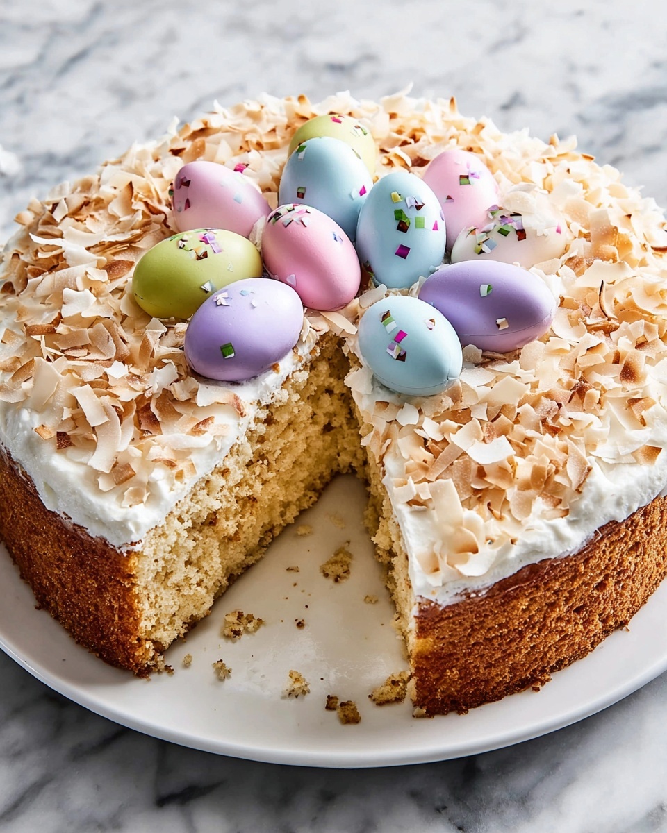 10. Frost and Decorate: Spread the cream cheese frosting evenly over the cooled cake. Sprinkle the top with sweetened shredded coconut, then fill the center hole of the Bundt cake with candy-coated chocolate eggs for a festive finish.