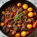 Beef Bourguignon, a classic French stew made easy at home following Julia Child’s iconic recipe. Tender beef chuck is slowly braised in red wine and beef broth with aromatic vegetables, bacon, and mushrooms, resulting in a rich, flavorful, and comforting dish perfect for any special occasion or cozy meal.
