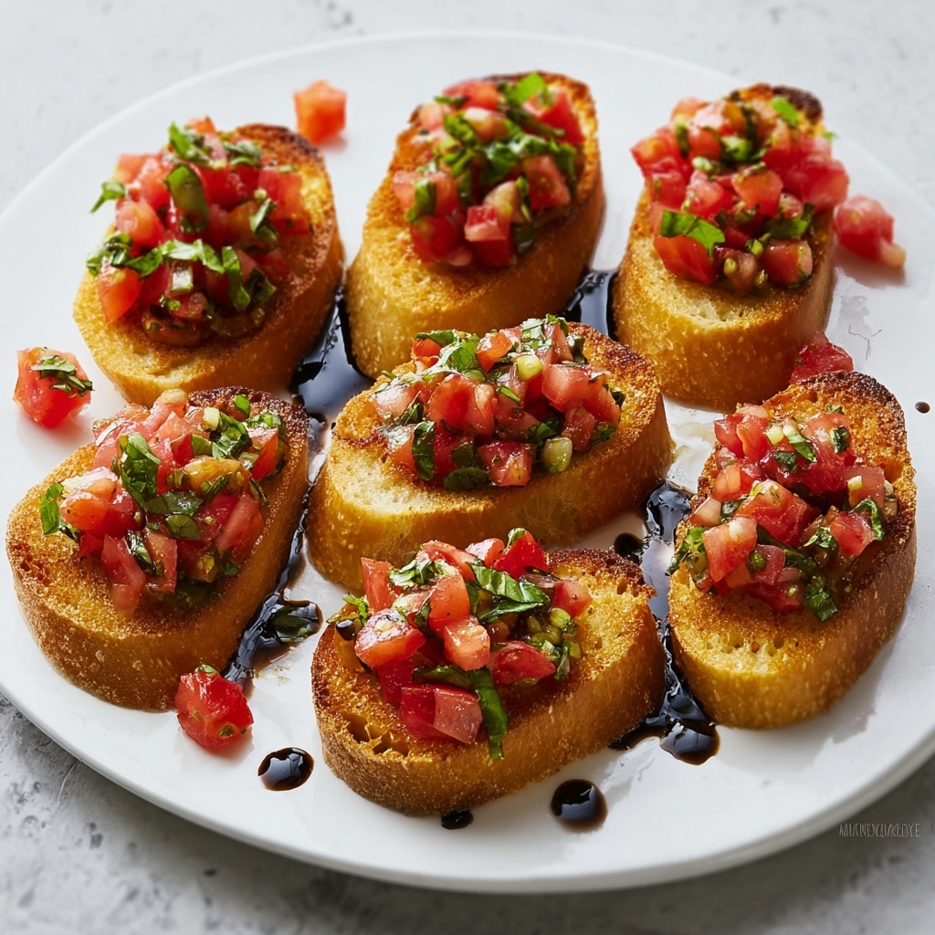 For a party, serve the tomato mixture in a decorative bowl alongside the toasted slices so guests can build their own bruschetta. Or lay the assembled pieces on a rustic wooden board with some olives and cheese for an elegant spread that invites sharing and conversation.