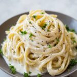 Finish by sprinkling freshly chopped parsley over the fettuccine. This bright green herb adds a fresh aroma and a lovely color contrast, lifting the entire dish aesthetically and flavor-wise. Your Fettuccine Alfredo Recipe is now ready to bring smiles to your table!