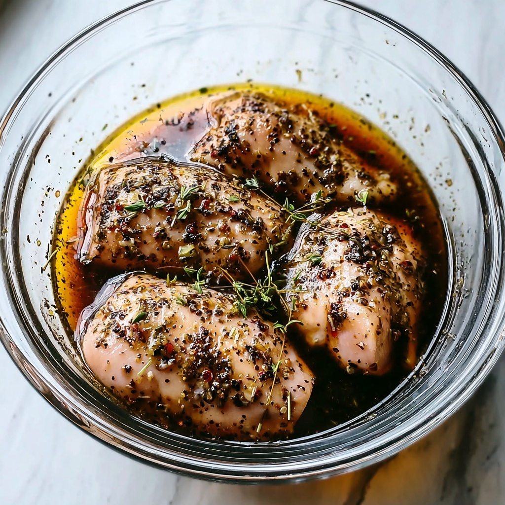 A flavorful and easy-to-make chicken marinade that combines olive oil, vinegar, soy sauce, Worcestershire sauce, lemon juice, brown sugar, herbs, and spices. Perfect for marinating chicken breasts to enhance tenderness and impart a rich, savory taste. Ideal for grilling, baking, or pan-searing.