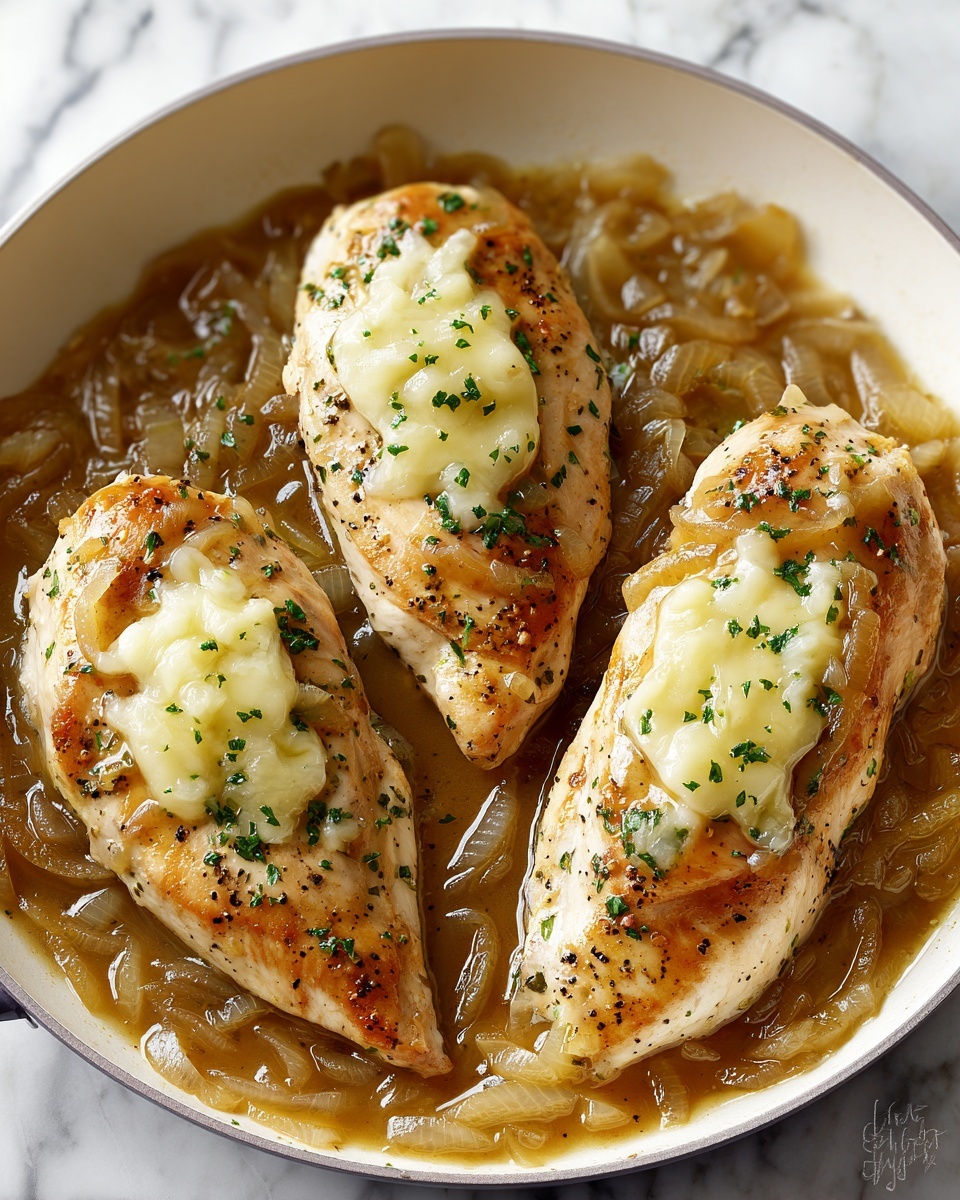 French Onion Chicken is a comforting and flavorful dish combining tender, seared chicken breasts with a rich, caramelized onion sauce inspired by classic French onion soup. Topped with a melty blend of Gruyère and mozzarella cheeses, this recipe delivers savory goodness perfect for a cozy weeknight dinner.