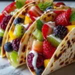 These colorful Fruit Tacos are a delightful twist on traditional tacos, featuring crispy cinnamon sugar tortilla shells filled with a fresh, vibrant medley of strawberries, kiwi, blueberries, mango, and pineapple. Topped optionally with whipped cream, Greek yogurt, shredded coconut, or mint, they make a perfect healthy dessert or kid-friendly snack that’s quick to prepare and bursting with refreshing flavors.