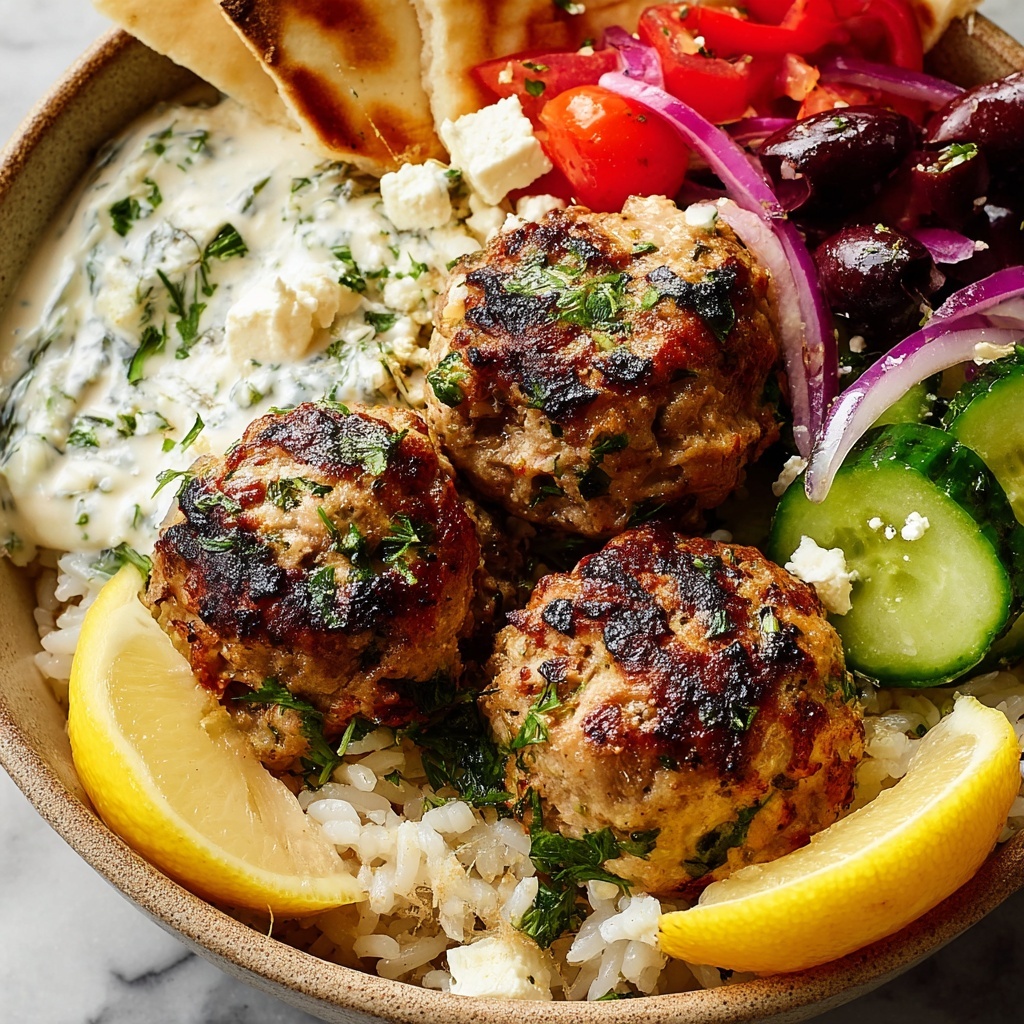 This Greek Chicken Meatballs Bowl is a vibrant and flavorful meal combining juicy chicken meatballs seasoned with herbs and Greek spices, served over fluffy basmati rice with fresh cucumber, cherry tomatoes, Kalamata olives, crumbled feta, and creamy tzatziki sauce. Perfect for a wholesome, Mediterranean-inspired dinner ready in just 30 minutes.