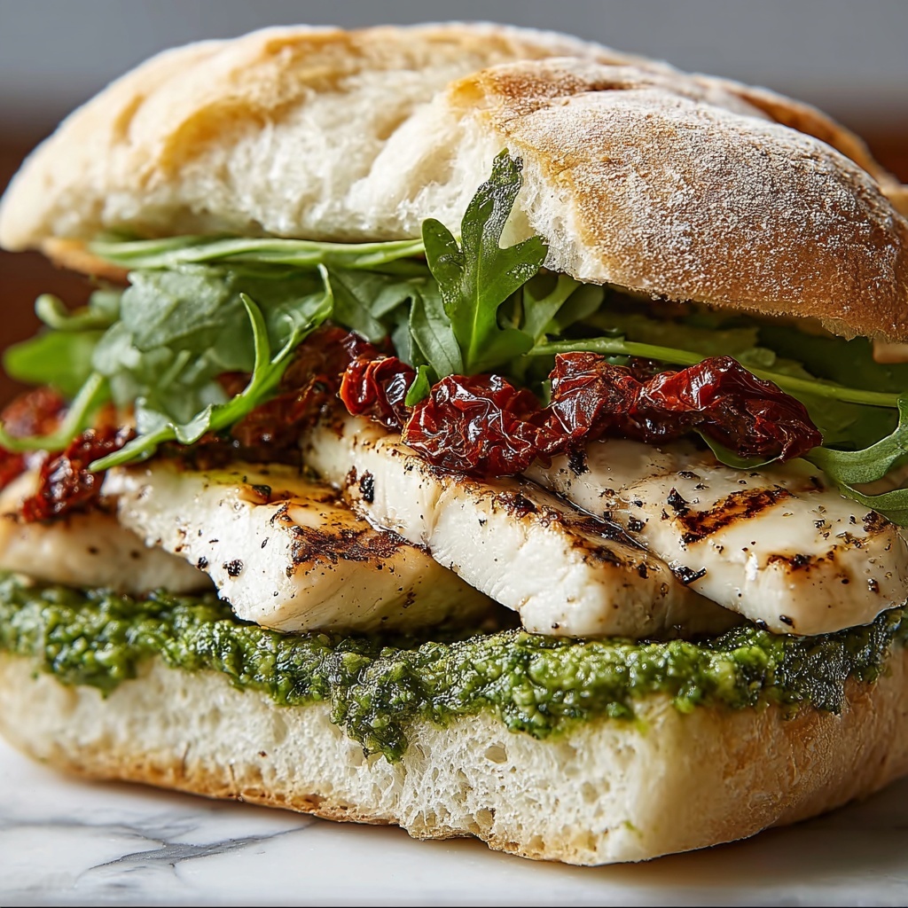 A delicious and easy grilled chicken sandwich featuring juicy chicken breasts seasoned and cooked to perfection, topped with melted cheese, fresh tomato, and peppery arugula, all layered with vibrant basil pesto on toasted ciabatta buns. Perfect for a satisfying lunch or dinner with a fresh, herbaceous twist.