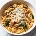 This Ground Beef Orzo with Tomato Cream Sauce is a comforting and hearty one-pot meal combining tender ground beef, flavorful tomato cream sauce, and tender orzo pasta. Fresh spinach and Parmesan cheese add layers of flavor and nutrition, making it an ideal weeknight dinner that’s both satisfying and easy to prepare.
