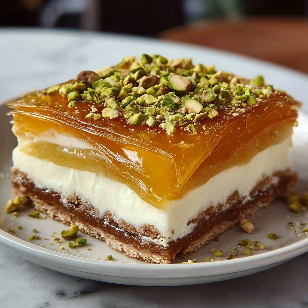 A decadent fusion dessert combining the rich creaminess of classic cheesecake with the nutty, sweet flavors of baklava, highlighted by honey, pistachios, and warm spices. Perfect for impressing guests or indulging in a special treat.