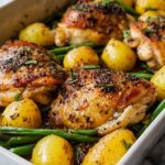 Cover your pan tightly with aluminum foil to keep the moisture locked in, then bake for 1 hour and 10 minutes. This slow, gentle baking time allows the chicken to cook through fully, the potatoes to soften and crisp just right, and the green beans to retain their vibrant color and snap.