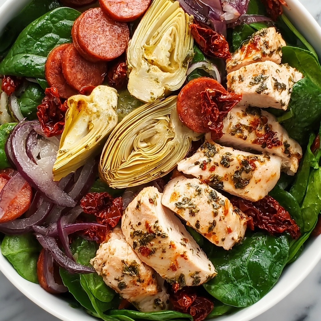 The magic of this Italian Salad with Chicken, Spinach, Artichokes, Salami, Sun-Dried Tomatoes, and Red Onions Recipe lies in its simple, fresh ingredients. Each component plays a vital role, adding color, texture, or a burst of flavor that makes the salad truly memorable.