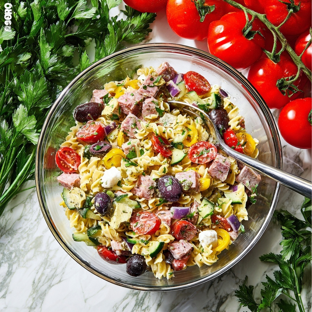 4. Combine Salad: In a large mixing bowl, add the cooled pasta, cucumber, tomatoes, salami, olives, pepperoncini, artichoke hearts, red onion, mozzarella, and parsley.