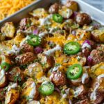Next, stir in finely diced red onion, cooked meat pieces, diced jalapenos, and shredded sharp cheddar cheese into your dressing. Each of these ingredients adds a unique texture and bold flavor, complementing the crispy roasted potatoes perfectly. The jalapenos bring authentic heat, while the cheese adds comforting melty goodness.