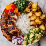 Now, the fun part: building the bowl. Start with a generous scoop of rice, add your spiced chicken, then layer on the black beans and corn mixture. Top it all off with diced red onion, chopped cilantro, and creamy avocado, finishing with a drizzle of lime juice and your preferred amount of salt and pepper. Each bite is an explosion of texture and flavor!