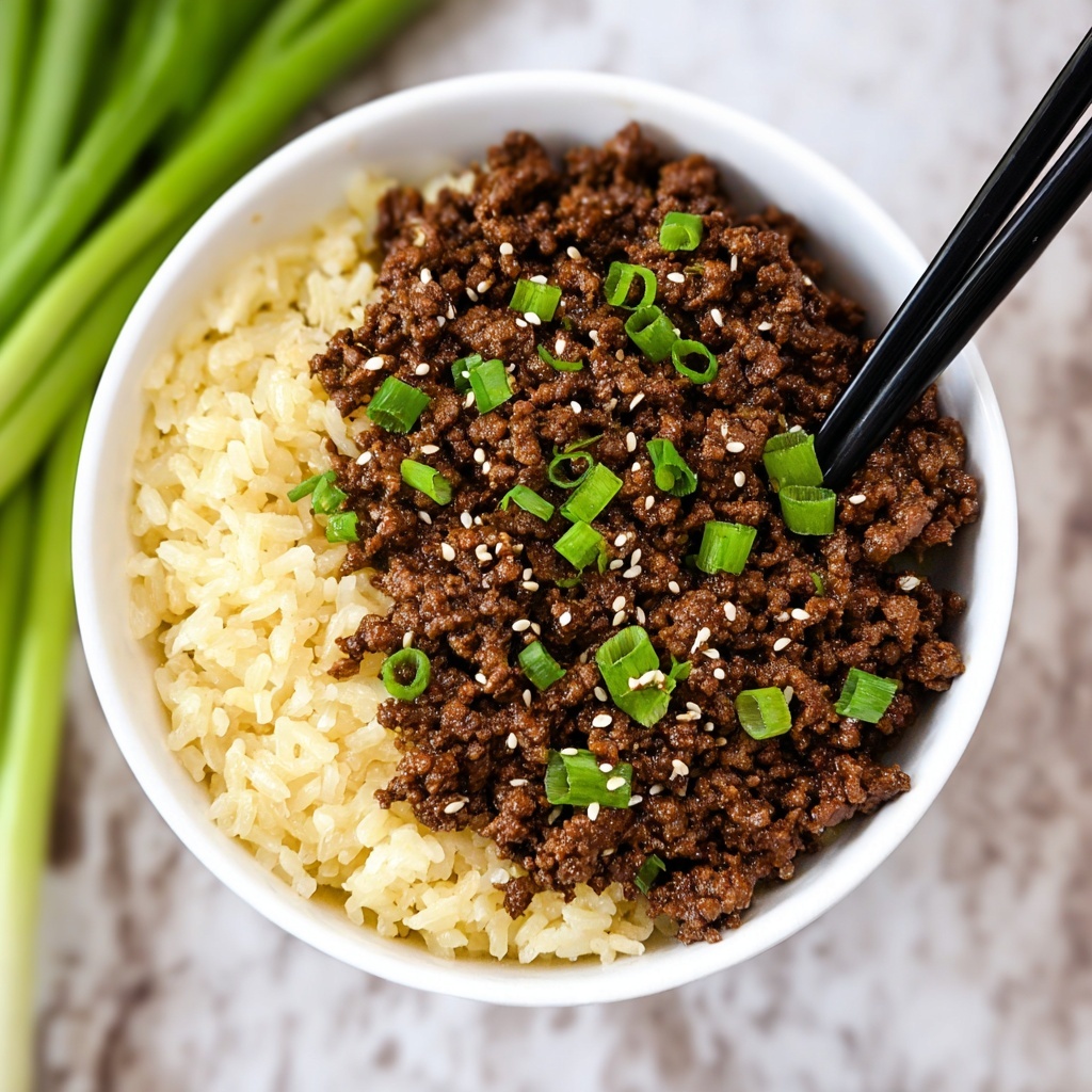 Divide the fluffy white or brown rice evenly among four bowls. Spoon the luscious Korean-style beef mixture generously over the rice. If you’re feeling fancy or want that extra burst of freshness, sprinkle sliced green onions and a handful of toasted sesame seeds on top. And just like that, your stunning Korean Beef and Rice Bowls Recipe is ready to enjoy!
