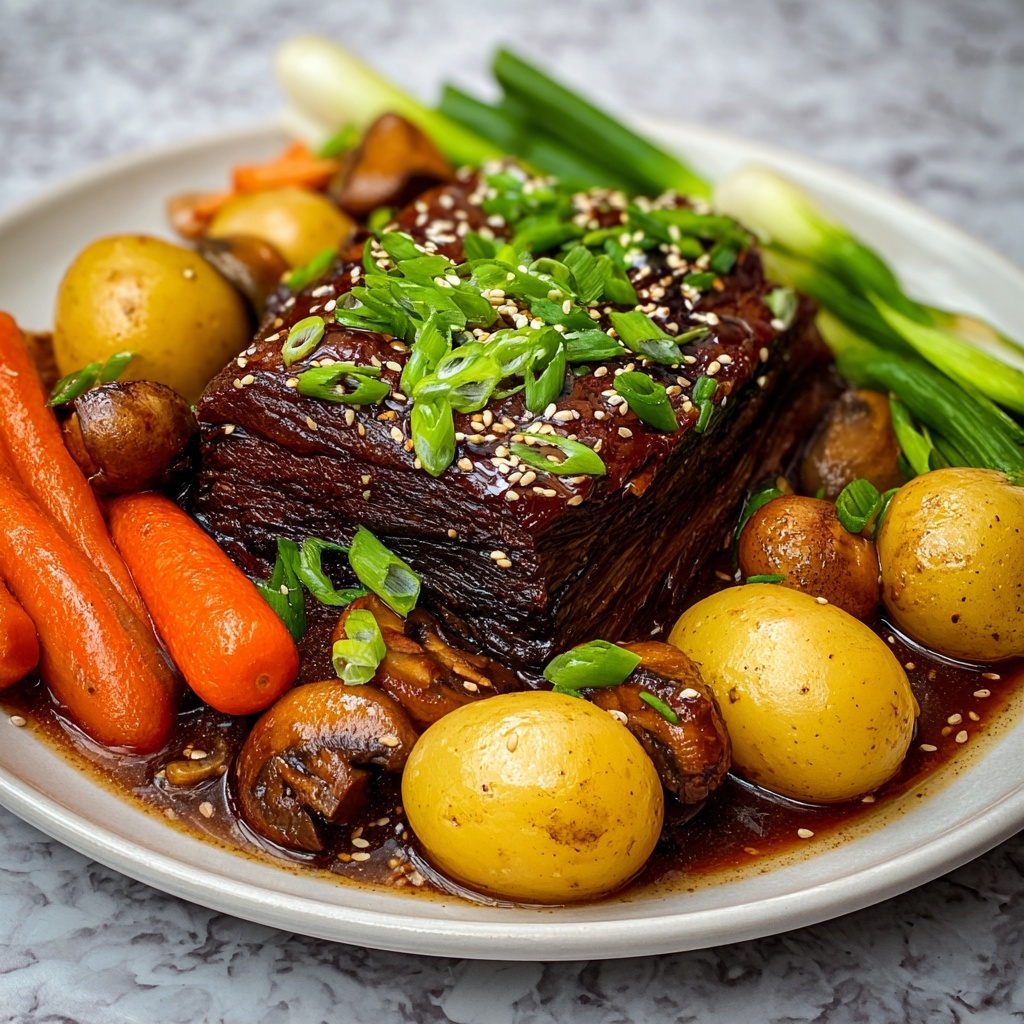 Garnishing with green onions and sesame seeds provides a crisp, fresh contrast to the rich flavors of the pot roast and gives that classic Korean finishing touch. You might also add thinly sliced fresh chili or a drizzle of extra sesame oil for more aroma.