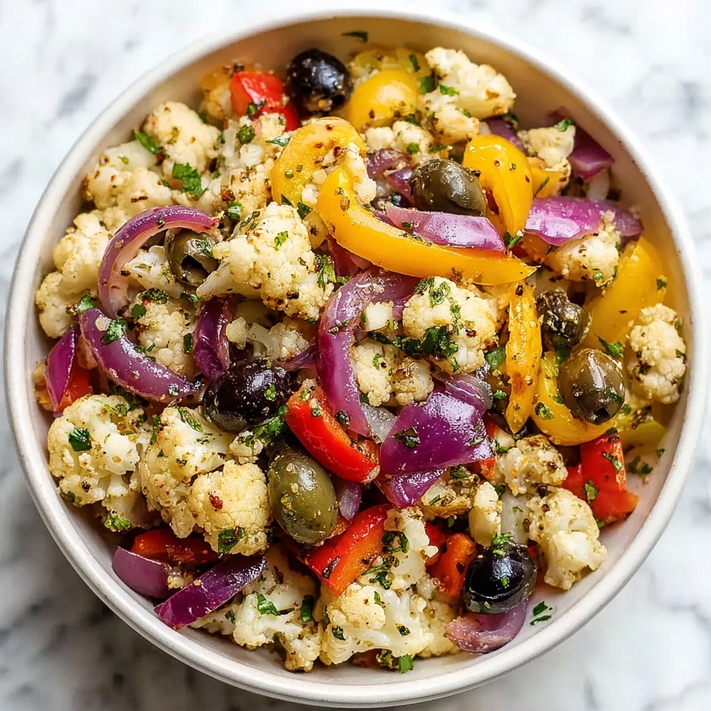 This Marinated Cauliflower Salad is a vibrant and flavorful dish featuring tender cauliflower florets combined with tangy olives, zesty banana pepper rings, crisp red bell pepper, and fresh red onion. Tossed in a zesty Italian-inspired dressing with Parmesan cheese, this salad is perfect as a refreshing side or light main dish. It requires no cooking and is best enjoyed after marinating to meld the flavors together.