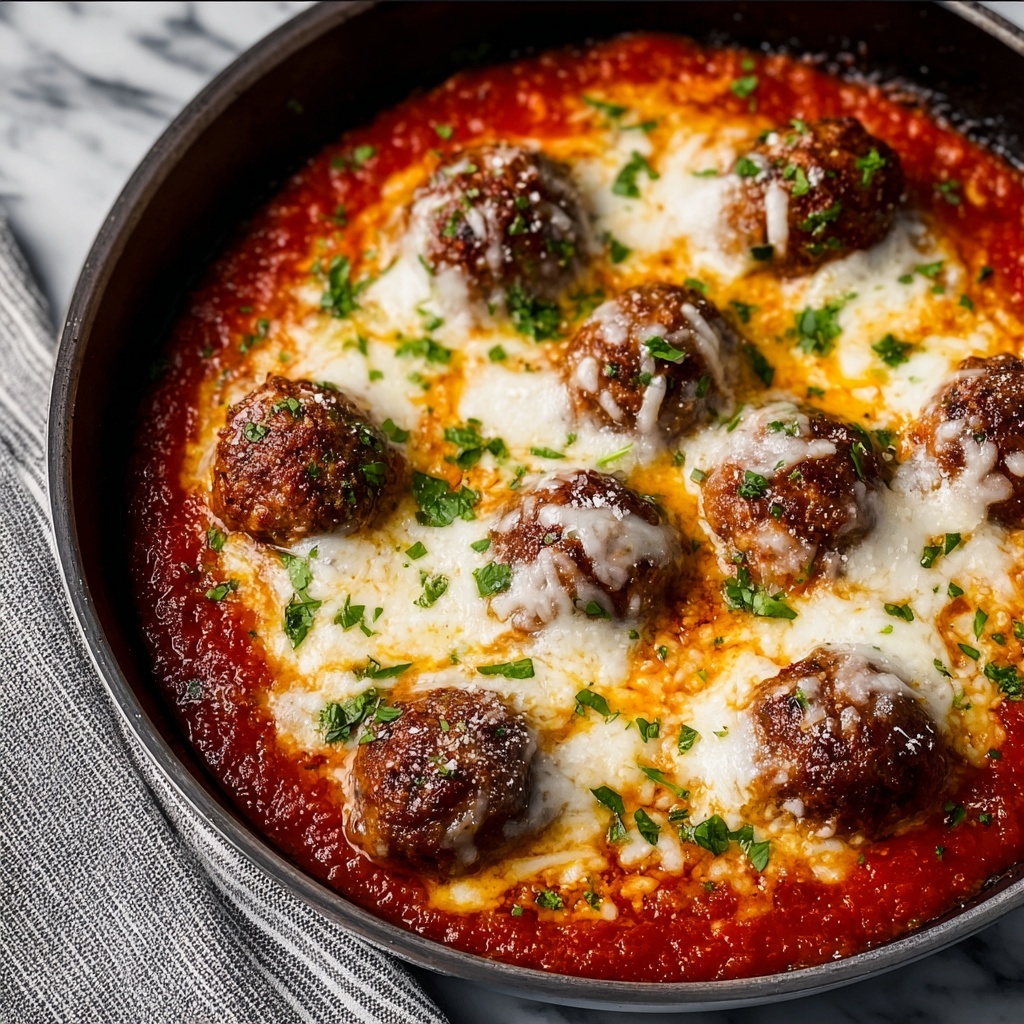 Classic Italian-American Meatball Parmesan featuring tender meatballs made from a blend of ground beef and pork, baked in a rich marinara sauce and topped with melted mozzarella and Parmesan cheeses. This comforting main course is perfect for a hearty family dinner.