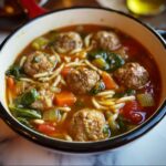 This hearty Meatball Soup features tender homemade meatballs simmered in a rich tomato and beef broth filled with fresh vegetables and pasta. Perfect for a comforting and satisfying meal, it combines classic flavors with a wholesome mix of ingredients to create a warming soup that’s ideal for family dinners or meal prep.
