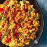 Push the tomato and pepper mixture to one side of your skillet to make space for the eggs. Lower the heat to medium-low and pour in the beaten eggs. Let them cook briefly, stirring gently and only as needed, so they become just set but remain luxuriously soft. Once the eggs are nearly done, carefully fold in the tomato and pepper mixture for a harmonious blend of flavors and a brilliantly colorful skillet.